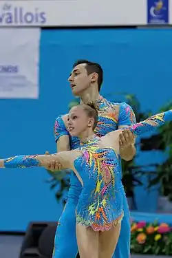 ![]() Artur Beliakou and Aliona Dubinina at the 2014 Acrobatic Gymnastics World Championships. | |