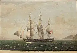 She was followed by two other ships by the same name. The first of these ships subject to major repairs undertaken by Børge Gabriel Lind at Copenhagen in 1804. She embarked on an expedition to either Canton or the East Indies under the command of captain Hans From in 1804.[3] She was severely damaged in a storm on the way back. She was subsequently sold by From on Mauritius (then Isle de France) and replaced by another ship by the same name.
