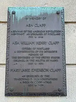 Clapp was born to Abiel Clapp, an established farmer and town magistrate in Mansfield, Massachusetts.[3] In 1787, Clapp married Eliza Wendell Quincy (died 1853, age 90) of Boston. She was the daughter of prominent physician Jacob Quincy and granddaughter of Boston merchant Edmund Quincy. Clapp was one of Portland's largest merchants at the time of his death. Several of his sons were also major merchants and were elected to political offices; Charles Q. Clapp, for whom the still-standing Charles Q. Clapp House and Charles Q. Clapp Block are named, one of them. Another son, Asa W. H. Clapp, represented Maine's 2nd congressional district in the 30th United States Congress (1847–1849).[2]