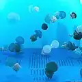 The warm and cold water exhibits at the aquarium (a total of 45 tanks containing 720 cubic metres (190,000 US gal) of water) feature marine animals such as sea otters, sea lions, seals, penguins, and dolphins.[4] The dolphin show tank is the largest in the facility and holds 703 cubic metres (186,000 US gal).[5][1] The seawater tank on the first floor includes a 15-metre (49 ft) acrylic tunnel for viewing the inhabitants from underneath.[6]