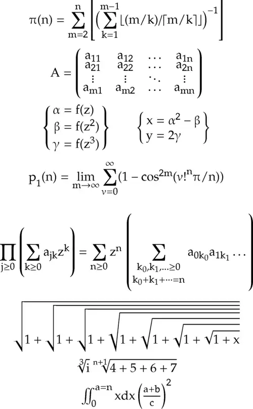 Asana-Math is an OpenType mathematical font with advanced layout features based on the OpenType Math extensions. It was developed by Apostolos Syropoulos,[1] based on the Type 1 pxfonts by Young Ryu.[2] Asana-Math is freely available under the Open Font License. The word Asana (Ἀσάνα, Asána) in the Doric dialect is the name of the Greek mythological goddess Athena. It is designed to look similar to, and to blend with, Palatino.[3]