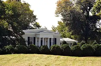 The house is one story with three bays flanked by one-story two-bay wings on either side. The sloping site makes the basement a full story on the south side of the main and west wings. The house is built of stone covered with stucco. A Greek Doric portico is centered on the main facade. An entrance hall extends across the front with a parlor behind. Halls extend into the center of each wing down a flight of three steps, with two rooms on either side. The garden features a boxwood hedge.[3]