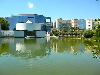 Adjacent to a floral park, the building sits above an artificial lake and gives the illusion of floating on the water.