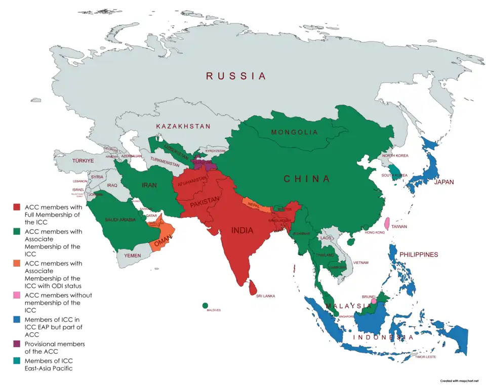 As of 2025, there are two ICC member nations which are in Asian continent but not in ACC, while they are in ICC East Asia-Pacific region.