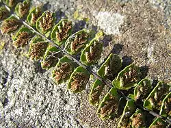 Asplenium trichomanes, the maidenhair spleenwort (not to be confused with the similar-looking maidenhair fern),[2] is a small fern in the spleenwort genus Asplenium. It is a widespread and common species, occurring almost worldwide in a variety of rocky habitats. It is a variable fern with several subspecies.