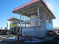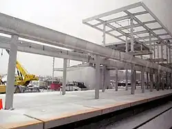 For construction, the MBTA shifted outbound trains to the normally unused express track and inbound trains to the outbound track, to give construction crews full access to the site.[15] In January 2013, the MBTA began constructing concrete pillars to support the platform and headhouses; elevator shaft construction began in the spring.[15] Construction of the headhouse frames began in June 2013, and the platform segments were laid in July. The headhouses were completed in June 2014, with work remaining on other parts of the station.[16]