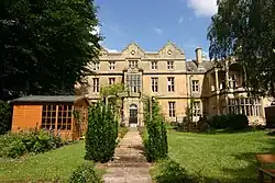 To the right of the main house is a stone Tudor arched garden entrance, to the left of the main house is a slightly later cross-gabled extension with clock and brick stable range with stone dressings.[2]
