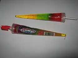 Astro Pops were first made in 1963 after two rocket scientists working on the space program in El Segundo, California decided to quit their jobs and create the Astro Pop, modeling the pop after a three-stage rocket.[1] They hand-built equipment, including machines to speed up the production of the cone wrappers. Astro Pops are unusual because the cone wrapper becomes the mold for the candy. Hot candy is poured directly into the wrapper, then a paper stick is added and the pop is capped off with a layer of wax.[1] Because Astro Pops were created in the 1960s, at the same time in history when the Space Race was in full force, millions of Astro Pops were sold when the manufacturers capitalized on this craze.[1]
