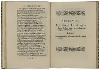 Astrophel: A Pastorall Elegy upon the Death of the Most Noble and Valorous Knight, Sir Philip Sidney is a poem by the English poet Edmund Spenser.[1] It is Spenser's tribute to the memory of Sir Philip Sidney, who had died in 1586, and was dedicated "To the most beautiful and vertuous Ladie, the Countesse of Essex", Frances Walsingham, Sidney's widow.