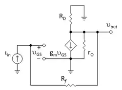Finding the asymptotic gain G∞ provides insight, and usually can be done by inspection. To find G∞ we let gm → ∞ and find the resulting gain. The drain current, iD = gm vGS, must be finite. Hence, as gm approaches infinity, vGS also must approach zero. As the source is grounded, vGS = 0 implies vG = 0 as well.[6] With vG = 0 and the fact that all the input current flows through Rf (as the FET has an infinite input impedance), the output voltage is simply −iin Rf. Hence