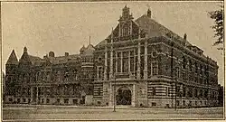 For a cost of $32,000, two lots were purchased at the corner of Michigan and New Jersey streets. A German neighborhood called Lockerbie Square, also known as Germantown, surrounded the clubhouse. Construction of the East Wing began in May 1893, and was finished in 1894. The West Wing construction started in 1897 and was completed in 1898.[3] German American architects Bernard Vonnegut Sr. (grandfather of Indianapolis novelist Kurt Vonnegut) and Arthur Bohn designed both wings.[4] It was called Das Deutsche Haus and hosted many organizations, including the German-American Veterans Society, the German-American School Society, the Socialer Turnverein Women's Club, the German Ladies' Aid Society, and the Turner Building and Savings Association.[5] There were 500 members by 1896.[5][6]
