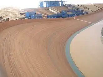 The Athens Olympic Velodrome is a velodrome stadium that is located in Marousi, Athens, Greece, at the Athens Olympic Sports Complex. The venue, which have the capacity for 5,250 people, but only 3,300 seats were used due to the security measures available for the 2004 Summer Olympic Games and the 2004 Summer Paralympics. It has distinctive twin roofs, covering the stands on each side.