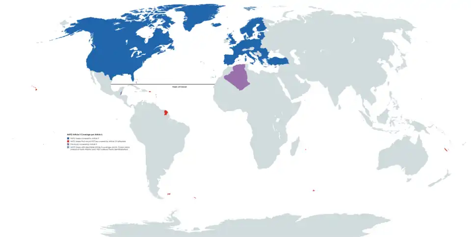 Article 6 states that Article 5 covers only member states' territories in Europe, North America, Turkey, and islands in the Atlantic north of the Tropic of Cancer.