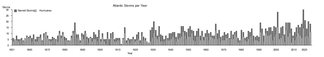 Atlantic tropical and subtropical cyclones that reach tropical storm intensity are named from a predetermined list. On average, 14 named storms occur each season, with an average of 7 becoming hurricanes and 3 becoming major hurricanes, Category 3 or higher on the Saffir–Simpson scale. The most active season on record was 2020, during which 30 named tropical cyclones formed. Despite this, the 2005 season had more hurricanes, developing a record of 15 such storms. The least active season was 1914, with only one known tropical cyclone developing during that year.[5]