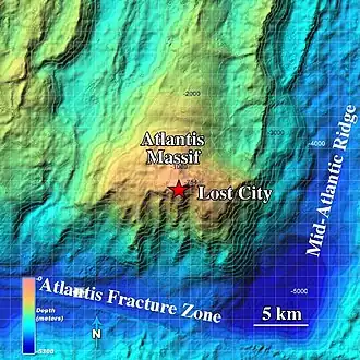 ![]() Undersea topography of the Atlantis Massif highlighting the location of the Lost City Hydrothermal Field | |