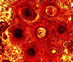 130. ^ Adriani, A.; Mura, A.; Orton, G.; Hansen, C.; Altieri, F.; Moriconi, M. L.; Rogers, J.; Eichstädt, G.; Momary, T.; Ingersoll, A. P.; Filacchione, G. (March 2018). "Clusters of cyclones encircling Jupiter's poles". Nature. 555 (7695): 216–219. Bibcode:2018Natur.555..216A. doi:10.1038/nature25491. ISSN 0028-0836. PMID 29516997. S2CID 4438233.