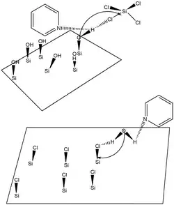 The use of catalysts is of paramount importance in delivering reliable methods of SiO2 ALD. Without catalysts, surface reactions leading to the formation of SiO2 are generally very slow and only occur at exceptionally high temperatures. Typical catalysts for SiO2 ALD include Lewis bases such as NH3 or pyridine and SiO2; ALD can also be initiated when these Lewis bases are coupled with other silicon precursors such as tetraethoxysilane (TEOS).[25] Hydrogen bonding is believed to occur between the Lewis base and the SiOH* surface species or between the H2O based reactant and the Lewis base. Oxygen becomes a stronger nucleophile when the Lewis base hydrogen bonds with the SiOH* surface species because the SiO-H bond is effectively weakened. As such, the electropositive Si atom in the SiCl4 reactant is more susceptible to nucleophilic attack. Similarly, hydrogen bonding between a Lewis base and an H2O reactant make the electronegative O in H2O a strong nucleophile that is able to attack the Si in an existing SiCl* surface species.[41] The use of a Lewis base catalyst is more or less a requirement for SiO2 ALD, as without a Lewis base catalyst, reaction temperatures must exceed 325 °C and pressures must exceed 103 torr. Generally, the most favorable temperature to perform SiO2 ALD is at 32 °C and a common deposition rate is 1.35 angstroms per binary reaction sequence. Two surface reactions for SiO2 ALD, an overall reaction, and a schematic illustrating Lewis base catalysis in SiO2 ALD are provided below.