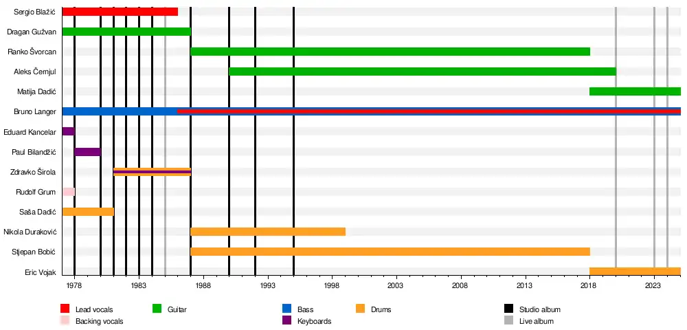 The first lineup of the band featured Sergio Blažić "Đoser" (vocals), Dragan Gužvan (guitar), Bruno Langer (bass guitar), Eduard Kancelar (keyboards), Saša Dadić (drums), and Rudolf Grum (backing vocals).[1] As a teenager, Langer competed as a middleweight boxer, before deciding to dedicate himself to music and becoming the bass guitarist for the Pula band Beat Stones in 1964.[1] After Beat Stones, he performed in the bands Fantomi (The Phantoms) and Logaritmi (The Logarithms).[1] At the beginning of the 1970s, Langer, Blažić (at the time playing the drums), Gužvan, Dadić and vocalist Branko Umković formed the cover band Hush.[1] In 1974, Langer moved to the Koper-based band Boomerang, where he was soon joined by Blažić, the two performing with the group until the autumn of 1976.[1]