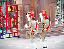 The ceremony at the Attari–Wagah border is a daily ceremony that the security forces of India (Border Security Force) and Pakistan (Pakistan Rangers) have jointly followed since 1959.[1] The drill is characterized by elaborate and rapid dance-like manoeuvres and raising legs as high as possible.[1] It is symbolic of the brotherhood as well as the rivalry that these two nations share.[2] The border troops exchange sweets with the opposing side during the Muslim holidays of Eid and Hindu holiday of Diwali.[3]