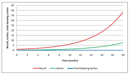 The reinforcing loop (R1 in figure 1 and 2) represents accelerating growth – a growing action is producing results. This is a positive feedback loop – the more the growing action taken, the higher the results level, and yet the result itself produces even more of growing action. Balancing loops (B2 and B3 in Figure 1 and 2) represent the way the system turns back to its original state. Result produced in the reinforcing loop is influenced within the balancing loop. There are (at least) two limits causing the slowing actions in the system and adding to them. Limiting actions start to influence the system at various levels of results, generally. Since that moment slowing actions act in the system simultaneously. Both the slowing actions contribute to the total slowing action. Total slowing action then inhibits the results (this process is delayed in time). If we get back to the reinforcing loop then we can see the inhibited results are reducing growing action which is leading to the reduced results again.