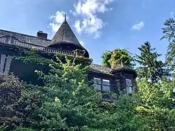 The 25-room[4] mansion is situated on a large plot of land and fronted by a two-acre sloped lawn that comes down to Kinderkamack Road.[5] Its location, prominent lawn, massive foundation, steeply pitched gable roof, and hexagonal towers with conical roofs make the mansion a landmark structure for the residents of the area.[5][2]