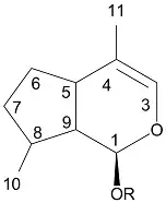 Aucubin is a monoterpenoid based compound.[7] Aucubin, like all iridoids, has a cyclopentan-[C]-pyran skeleton.[7] Iridoids can consist of ten, nine, or rarely eight carbons in which C11 is more frequently missing than C10.[7] Aucubin has 10 carbons with the C11 carbon missing. The stereochemical configurations at C5 and C9 lead to cis fused rings, which are common to all iridoids containing carbocyclic- or seco-skeleton in non-rearranged form.[7] Oxidative cleavage at C7-C8 bond affords secoiridoids.[8] The last steps in the biosynthesis of iridoids usually consist of O-glycosylation and O-alkylation. Aucubin, a glycoside iridoid, has an O-linked glucose moiety.