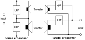 In this topology, the individual filters are connected in series, and a driver or driver combination is connected in parallel with each filter. To understand the signal path in this type of crossover, refer to the "Series Crossover" figure, and consider a high-frequency signal that, during a certain moment, has a positive voltage on the upper Input terminal compared to the lower Input terminal. The low-pass filter presents a high impedance to the signal, and the tweeter presents a low impedance; so the signal passes through the tweeter. The signal continues to the connection point between the woofer and the high-pass filter. There, the HPF presents a low impedance to the signal, so the signal passes through the HPF, and appears at the lower Input terminal. A low-frequency signal with a similar instantaneous voltage characteristic first passes through the LPF, then the woofer, and appears at the lower Input terminal.