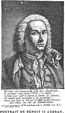 Benoît Audran, called the Younger, to distinguish him from his uncle Benoît Audran the Elder, was a French artist born in Paris in 1698, and died there in 1772. He was the son and pupil of Jean Audran, and engraved in the same manner as his father. He engraved prints after Paolo Veronese, Poussin, Natoire, Lancret, Watteau, and other French artists.