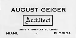 Geiger was born in New Haven, Connecticut, the son of Margaretha (Rettenmeyer) Geiger and Louis Geiger, a manufacturer of moldings and other fine woodwork for interior decoration. He was educated at the city's public schools, and completed his studies at Boardman's Manual Training School. Showing a talent for drawing and design, he determined to be an architect and secured a position in a New Haven firm. In 1905, Geiger moved to Miami, where he had vacationed with his family since around 1899, and worked at a local architectural firm for 6 years.[2] The 10th registered architect in Florida, he opened his own firm in 1911, and in 1915 opened a second office in Palm Beach. He worked for Carl Fisher on various construction projects in Miami Beach, and was appointed architect for the Dade County School Board.[3] In 1915 he married Ruth Hinson.[4]
