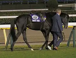 ![]() Auguste Rodin being led in the paddock before the 2023 Breeders Cup Turf | |