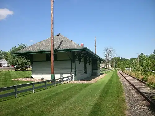 Aurora is the former train station serving the residents of Aurora, Ohio, located within Portage County, Ohio, USA. The station was constructed in 1872 by the New York, Pennsylvania and Ohio Railroad, which had absorbed the former Cleveland and Mahoning Valley Railroad, which ran from Cleveland, Ohio to Leavittsburg, Ohio. The next station to the northwest was Geauga Lake, serving the Geauga Lake amusement park. The next station to the southeast was Mantua. The line was entirely acquired by the Erie Railroad in 1941 after dissolution of the New York, Pennsylvania and Ohio. The last train left Aurora station on January 14, 1977.[3] After the line was abandoned, the rails were taken up. The station depot, one of three still standing along the branch (along with Solon and Mantua), was listed in the National Register of Historic Places on May 22, 1986.