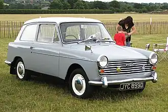 The Countryman hatchback appeared exactly a year later in October 1959,[9] and differed from the saloon in that the rear window was marginally smaller, to allow for a frame that could be lifted up, with its own support, while the lower panel was now flush with the floor and its hinges had been strengthened.[10] It was a very small estate car with a horizontally split tailgate having a top-hinged upper door and bottom-hinged lower door. October 1959 also saw the standardisation on both cars of self-cancelling indicators and the provision of a centre interior light and, in early summer 1960, a flat lid was added over the spare wheel in the rear luggage compartment.[9]