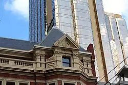 Nahum Barnet’s approach to architecture was a bold functionality of elements into a well-developed whole. He combined finely detailed and complete decorative elements with plain walls and durable massing, working across a variety of styles. He was a strong advocate for climate as a design factor and had an interest in developing an appropriate and suitable style for Australia, which he promoted in the press in the 1880s. He cleverly moved through the changing styles of architecture during his decades of practice, from Gothic Revival and Romanesque Revival to bold freestyle Classicism.[1] The design used red brick as a main material, a hallmark of the Queen Anne, and one that was characteristic of his work in the 1900s, such as the nearby 1913 Auditorium Building.[2]