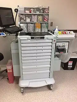 An automated dispensing cabinet (ADC), also called a unit-based cabinet (UBC), automated dispensing device (ADD), or automated dispensing machine (ADM)[1], is a computerized medicine cabinet for hospitals and healthcare settings. ADCs allow medications to be stored and dispensed near the point of care while controlling and tracking drug distribution.