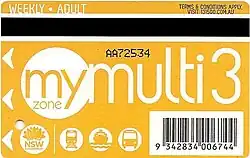 Existing multi-modal tickets TravelPass, DayTripper and BusPlus were replaced with a series of periodical train, bus and ferry tickets called MyMulti. A MyMulti ticket offered unlimited bus and ferry travel and train travel within a given zone. Zone MyMulti1 covered inner city trains, MyMulti2 covered most of the suburban Sydney train network and MyMulti3 covered all suburban, intercity and regional trains of the CityRail network.