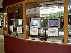 The specific computers used in the weather map display system are two Macintosh IIvx computers built in 1992, a Macintosh LC III from 1993, a Macintosh Centris 610 from 1994 and two Power Macintosh 8500 computers built in 1995 that display animated weather maps. Software includes Okey Dokey Pro, Cron, JPEGView, and Applescript. QuickTime Pro is used for the animated weather map display.