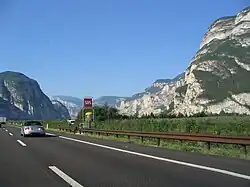 In the section between Trento Sud and Rovereto Nord, a pilot project of the so-called "third dynamic lane", which includes the use of the breakdown lane as a normal drive lane when occurring particular situations such as traffic congestions. This is signalled to drivers by determined lightning Variable-message signs along the route as they display green arrows if the breakdown lane is usable as a normal lane, oblique yellow arrows if the third lane is being shut down, and red crosses if the third lane is closed and can be used only in case of emergency.[6] This project includes the use of the dynamic lane technique also in the segment between Bolzano Sud and Verona Nord tollbooths,[7] where it is scheduled to take place the interchange with the third permanent lane (which is going to be built) up to the intersection with motorway A1 in Modena.[8]