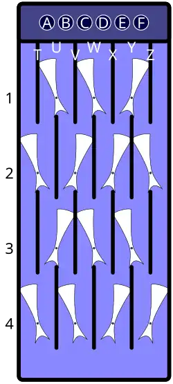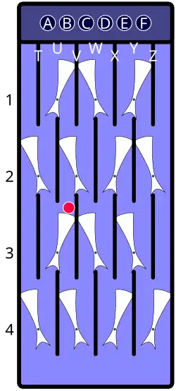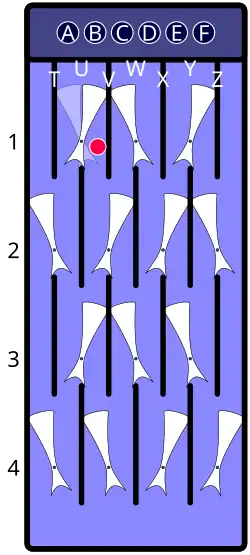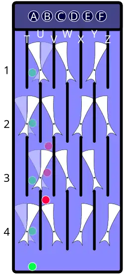| Descrip. | Arbitrary starting position; all gates have been set to the left or the right. Assume a marble is dropped through the hole labeled "B", next to the leftmost hole. | As the marble travels down the "B" lane, moving past the upper part of the gate with its pivot at U1, it strikes the bottom part of the gate, causing U1 to flip to the right. | As the marble continues to travel down the "B" lane, it next strikes the bottom part of the V2 gate, causing V2 to flip to the left. | Since the U3 gate is already flipped to the right, its state does not change and U3 stops the marble, which comes to rest on the upper part of that gate. | Dropping another marble down the "A" lane switches the positions of U1, T2, U3, and T4; this second marble ends up at the bottom; because the second marble causes U3 to flip to the left, U3 releases the first marble, which travels down the "B" lane, flipping U3 back to the right. The first marble is then caught by V4. | ||||||