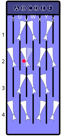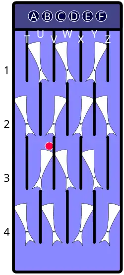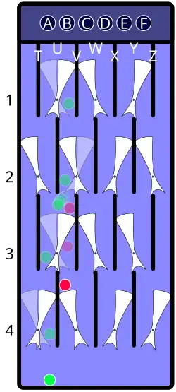 | Descrip. | Arbitrary position with one loaded gate at U3. Assume a marble is dropped through the hole labeled "B", next to the leftmost hole. | As the dropped marble travels down the "B" lane, it switches the unloaded gates at U1 and V2. At U3, it is shunted to the "A" lane, where it switches the loaded gate at U3. The freed marble that was loaded at U3 is now released, causing the gate at U3 to switch back to its prior position. The second marble continues down the "A" lane, where it switches gate T4 and then drops to the bottom. The freed marble continues down the "B" lane, coming to rest atop the gate at V4. | |||