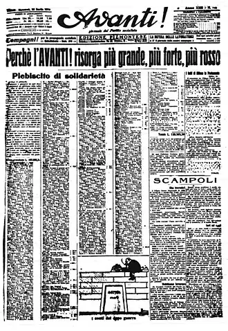 On 23 April 1919, the newspaper, printed in Turin, launched a "solidarity plebiscite" urging its readers and militants to subscribe to support the rebuilding of the Milan headquarters.[23] On 3 May 1920, Avanti! reappeared in the city.[24]