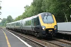 In 2024, all the Class 221 Super Voyagers were replaced by 23 new trains from the Hitachi A-train family, with maintenance taking place at Alstom's Oxley TRSMD depot in Wolverhampton.[48][49] These trains are divided into thirteen Class 805 bi-mode multiple units and ten Class 807 electric multiple units.[50] Although the units have the same top speed, they do not tilt like the Class 390 Pendolinos nor the Class 221 Super Voyagers they replaced. The Class 805s are used on services to Chester, Wrexham General and North Wales, and the Class 807s are used on services to Birmingham New Street, Blackpool North and Liverpool Lime Street (alongside the Pendolinos).[46][51]