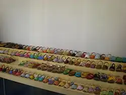 The avarca (Catalan pronunciation: [əˈβarkə], plural avarques) is a type of sandal popular in the Balearic Islands (Spain), especially Menorca, where they are commonly known as "Menorcan sandals". In addition to being a traditional type of footwear, Avarca is also a popular Spanish brand of sandals. The shoes are made using a leather upper and a rubber sole.[1] Avarca is a traditional sandal originally developed in Menorca in the Balearic Islands. They were originally made from a leather upper and with the sole made from a recycled car tyre. Nowadays however the soles are made in the style of a car tire but from a purpose made mould. These are hard wearing and much lighter in weight than the original car tire sole. Only original avarca manufacturers are granted with the label "Avarca de Menorca". This label is granted by local Government and guarantees that avarcas accomplishes minimum quality standards and avarcas are really manufactured in Menorca island.[2]