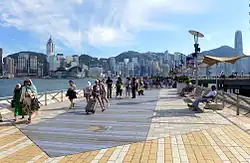 The promenade commands a panoramic view across Victoria Harbour. At night, it is a popular viewing place for the Symphony of Lights display.