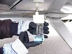 Taking a fuel sample from an under-wing drain using a GATS Jar fuel sampler. The blue dye indicates that this fuel is 100LL.