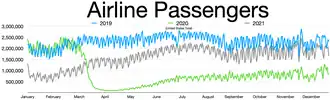 From the start of the Great Recession to the early 2010s, air traffic in the U.S. declined and the U.S. government reported 1.2 million fewer scheduled domestic flights in 2013 than in 2007.[7] Air traffic volume also dropped sharply during the Covid-19 pandemic.[8] At the same time, the airline industry has also experienced rapid consolidation with all of nation's largest carriers experiencing mergers.[7] The average domestic airline fare steadily increased from 2009 until the first quarter of 2017 where it retreated to the same average of 2009, the lowest the average fare has been since 1995.[9]