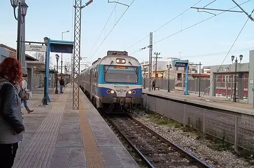 Avlona railway station (Greek: Σιδηροδρομικός σταθμός Αυλώνας, romanized: Sidirodromikos Stathmos Avlonas) is a station on the Piraeus–Platy railway line in Avlona, a settlement north of Athens urban area, in the northern part of the Athens metropolitan area, in the municipality of Oropos, East Attica, Greece. It was inaugurated on 8 March 1904. It is owned by OSE, but services are provided by TrainOSE, through the Athens Suburban Railway from Athens to Chalcis.[5] The station sits slightly above street level and can be accessed by either stairs or ramp.