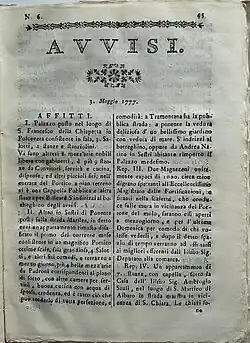 Avvisi (initially Foglio di notizie ed avvisi diversi) was a newspaper published in Genoa from 1777 to 1797.[1] It mainly was composed by classified advertising, reports of local events and curious information, without any political news because of censorship.