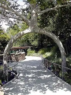 In 1945, Erlandson's daughter and his wife visited the ocean near Santa Cruz, California, where they saw people lined up to pay to see such oddities as tilted buildings at the Mystery Spot. They returned home and mentioned offhandedly to Axel that if his trees were on a well-traveled tourist route, they might draw people who would pay to see them. Axel jumped on the idea and bought a small parcel of land, on the main road between the Santa Clara Valley and the ocean, in Scotts Valley, California, where he started the process of transplanting the best of his trees to their new home.[8] To create the "Basket Tree", Erlandson planted six sycamore trees in a circle, topped them all at one foot, then approach-grafted them together one to another to form the diamond patterns. For the first 8 feet (2.4 m) he left an opening at the top. This specimen today is featured as the centerpiece of Gilroy Gardens.