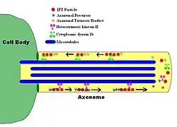 ![]() Eukaryotic flagellum. 1-axoneme, 2-cell membrane, 3-IFT (intraflagellar transport), 4-basal body, 5-cross section of flagellum, 6-triplets of microtubules of basal body. | |