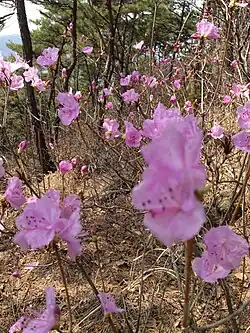 Sobaeksan, one of the 12 well-known Sobaek Mountains, lying on the border between Chungbuk Province and Gyeongbuk has a royal azalea (Rhododendron schlippenbachii) festival held on May every year. Sobaeksan has an azalea colony dotted around Biro mountaintop, Gukmang and Yonwha early in May. When royal azaleas have turned pink in the end of May, it looks like Sobaeksan wears a pink Jeogori (Korean traditional jacket).[12]